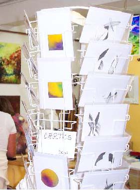 Les cartes sont conçues comme des vitraux miniatures : des huiles sur calque sont ajustées à de petites fenêtres de papier.
