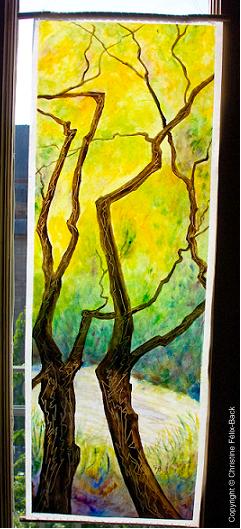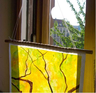 Les tableaux sur papier calque sont réalisés d'après une technique originale. Les surfaces colorées s'animent avec les variations de la lumière grâce à la translucidité du support. C'est pourquoi ils sont montés sur deux bambous pour être suspendus devant une fenêtre. Leur format rappelle les kakemonos traditionnels japonais. |